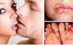 При занятии оральным сексом с больным партнером на слизистой во рту появляется белый шанкр, далее инфицированный станет источником заражения для любого, кого он поцелует.